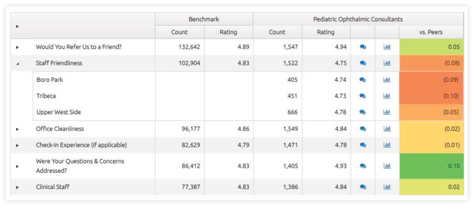 For Pediatric Ophthalmic Consultants, “Staff Friendliness” is (0.08) below the benchmark. Digging deeper, we can see that the Tribeca location is rated lowest among all locations.