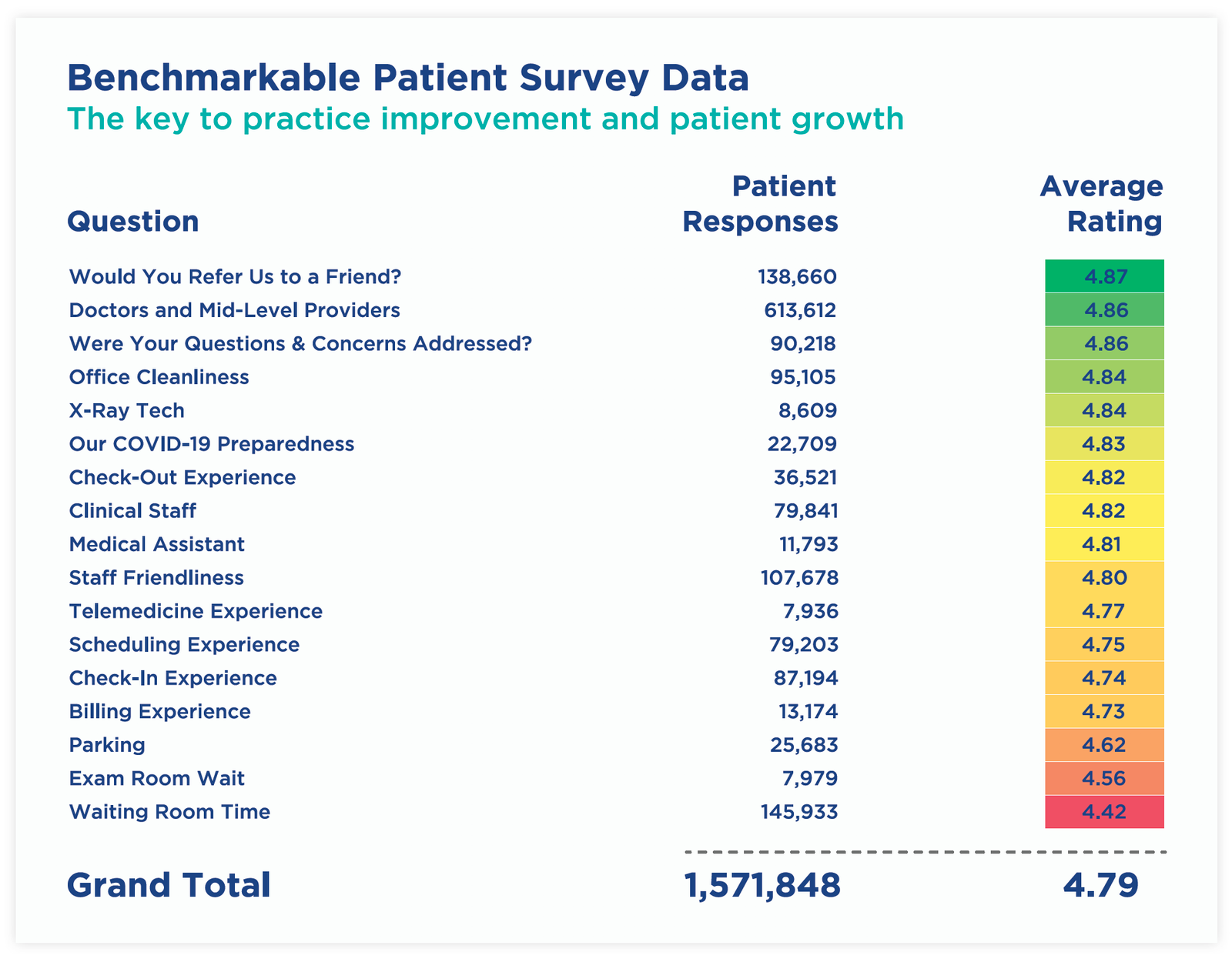 rater8 has the largest database of benchmarked patient survey data. As depicted in the chart below, rater8 has solicited 1.6 million data points from patients. Across rater8 clients, the highest rated question is “Would You Refer Us to a Friend?” and the lowest rated question is “Waiting Room Time.”